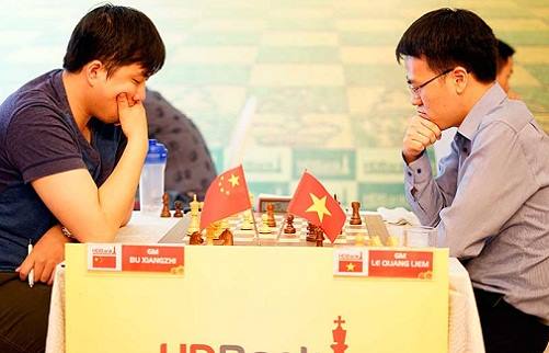 Lê Quang Liêm (Phải) trong trận đại chiến nhà vô địch Trung Quốc Bu Shangzhi (trái)